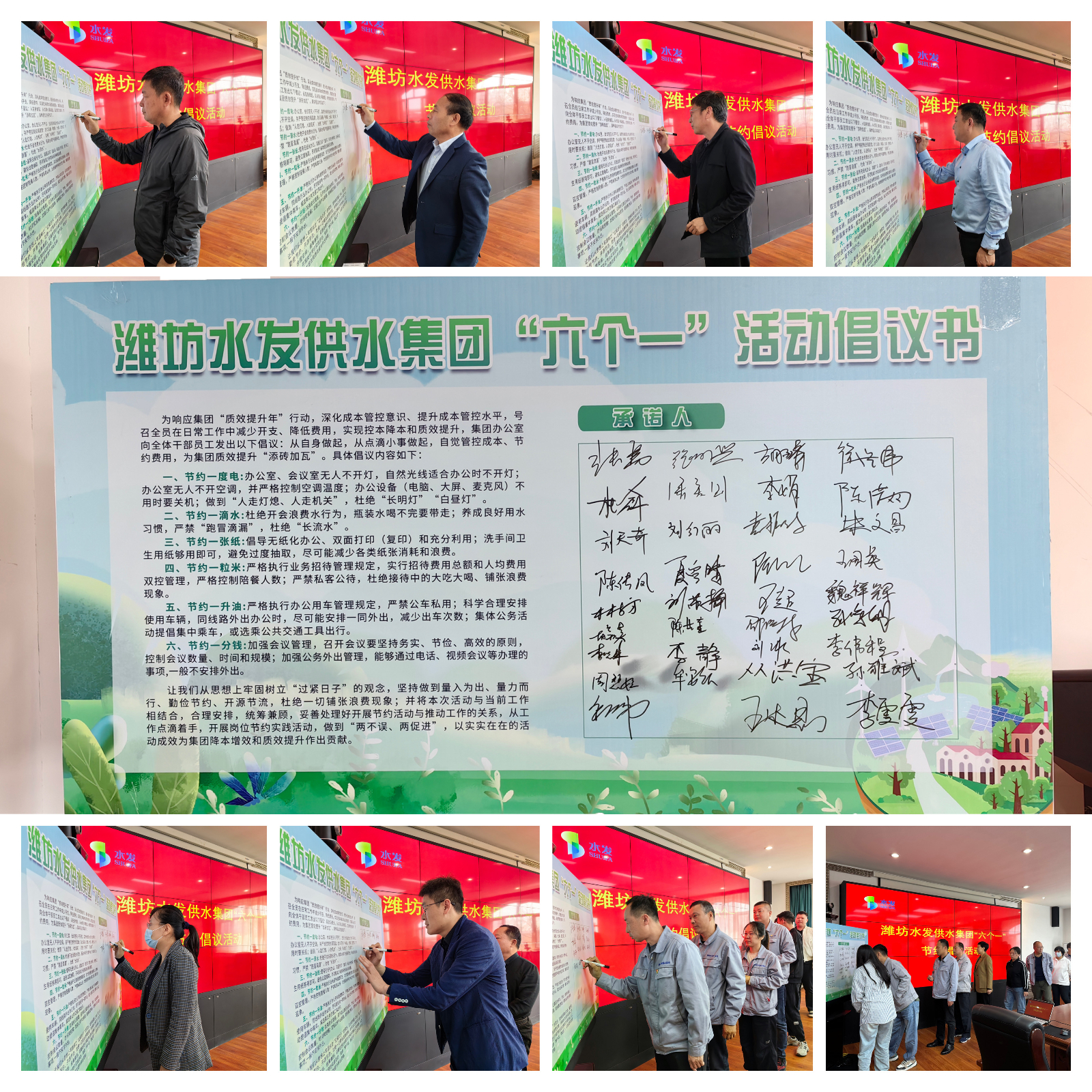 會上,供水集團黨總支書記、董事長張勇首先宣讀了“六個一”活動倡議書,號召全體員工提升降本增效意識,爭做勤儉辦公、節(jié)能降耗的先進模范。隨后,供水集團領(lǐng)導班子成員及參加活動的干部職工紛紛在活動展板上簽上自己的名字,承諾自覺踐行“六個一”節(jié)約倡議。